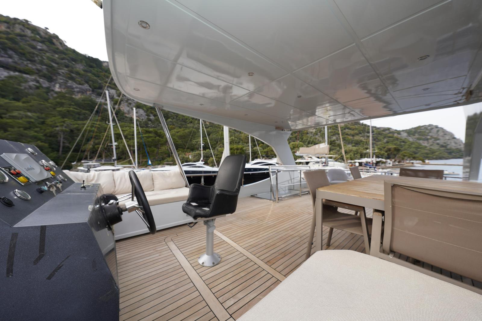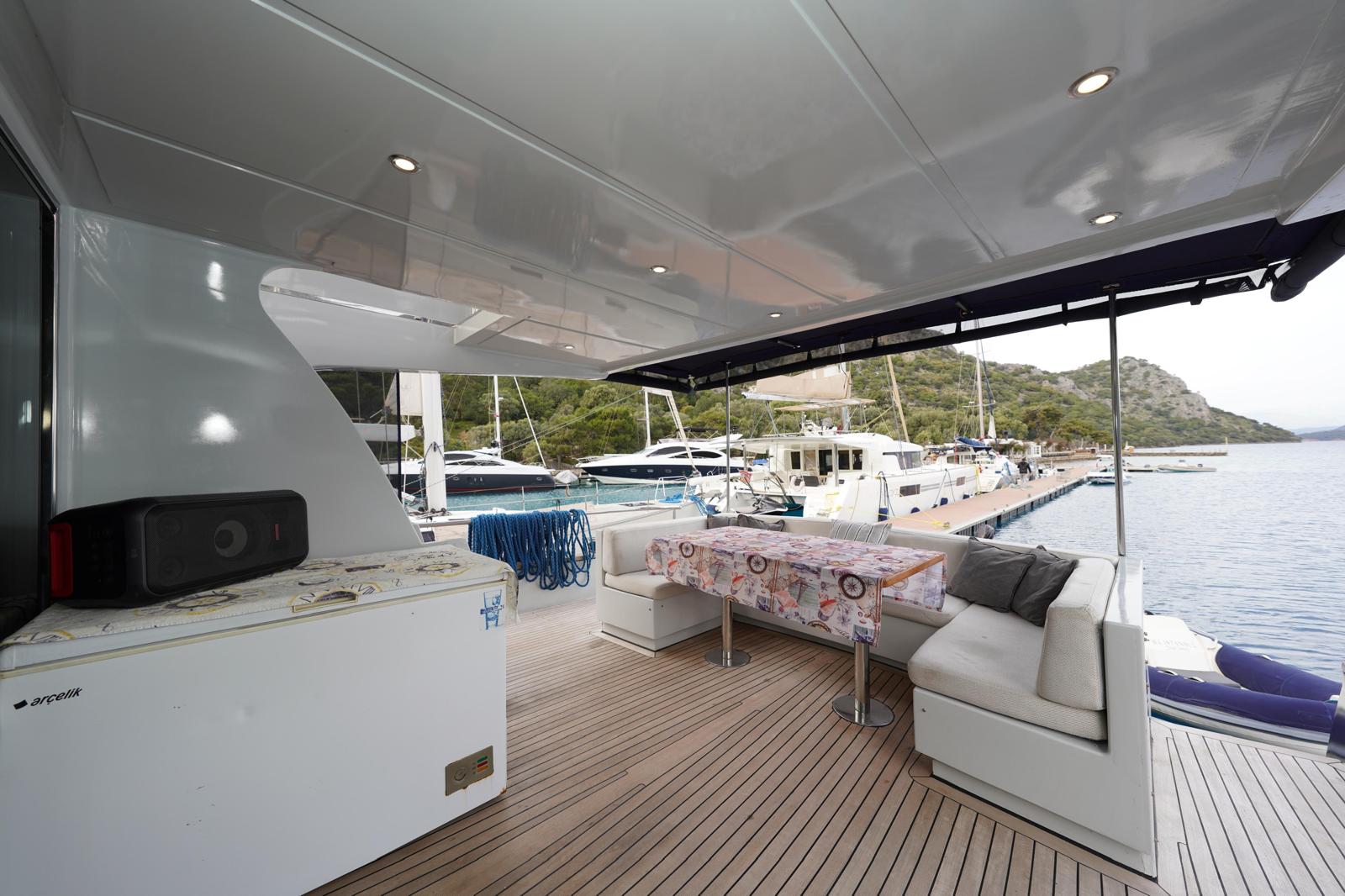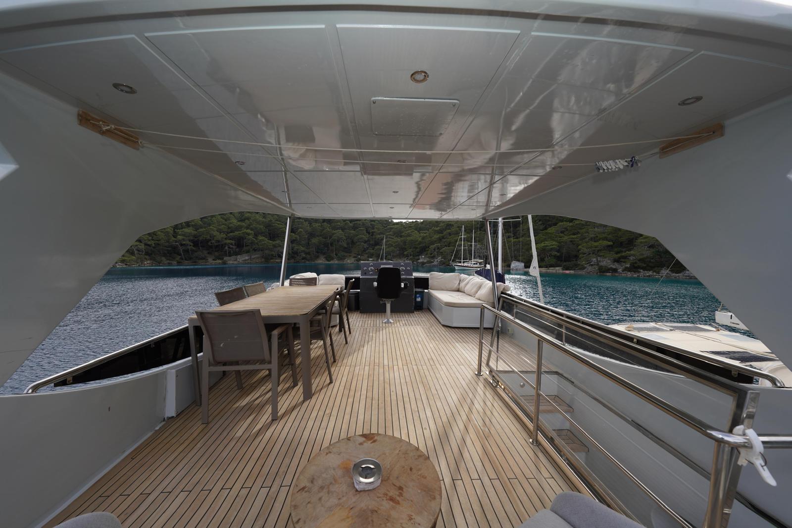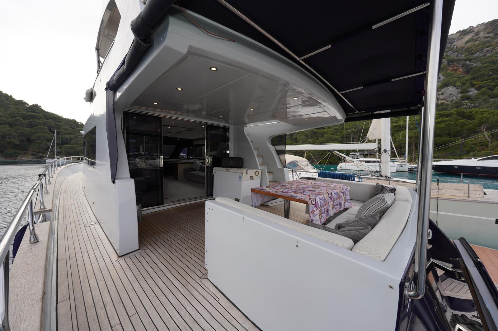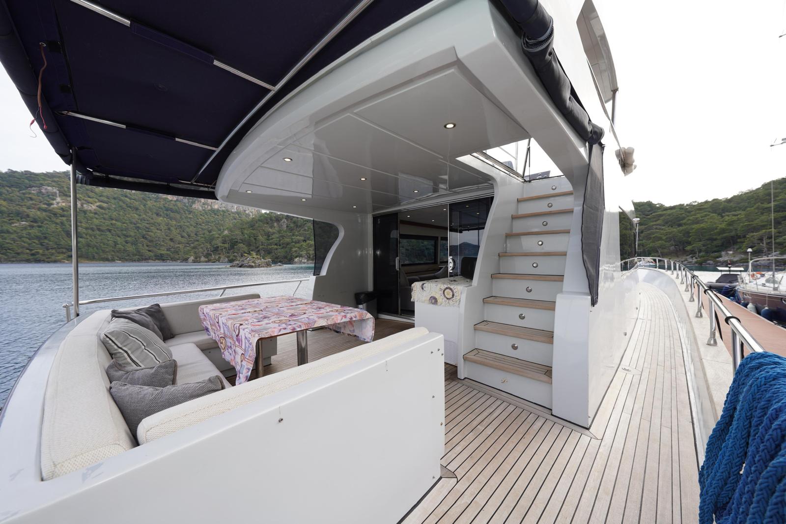 You can watch the sea from above in the flybridge area, welcome the sunset on the large deck, and enjoy delicious meals in the stylish aft seating area.