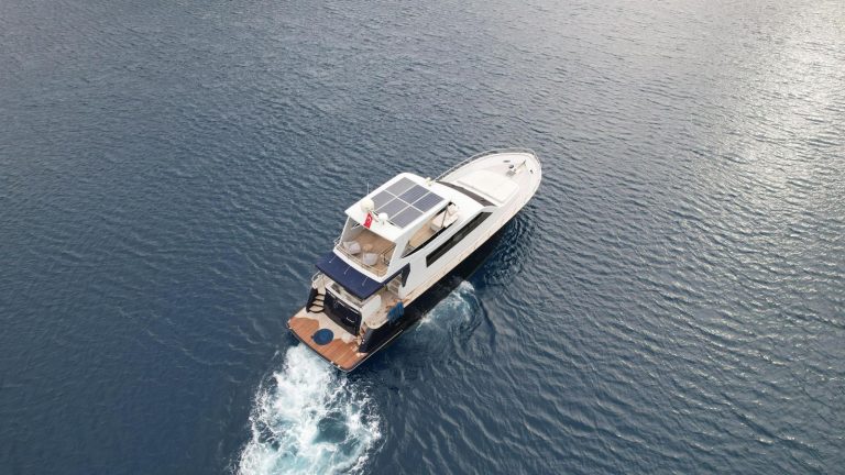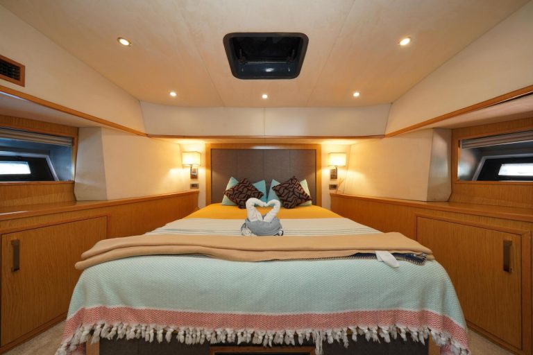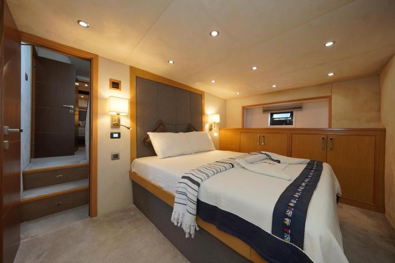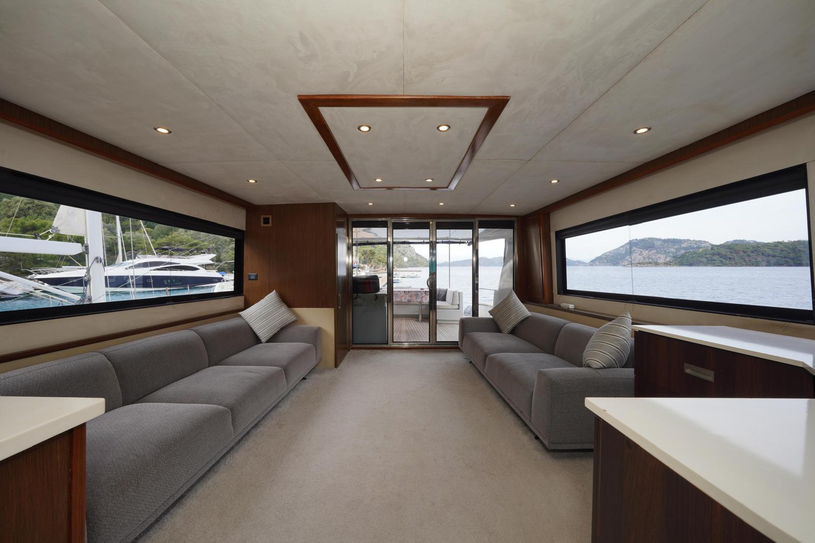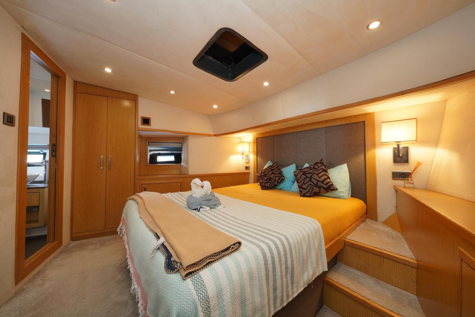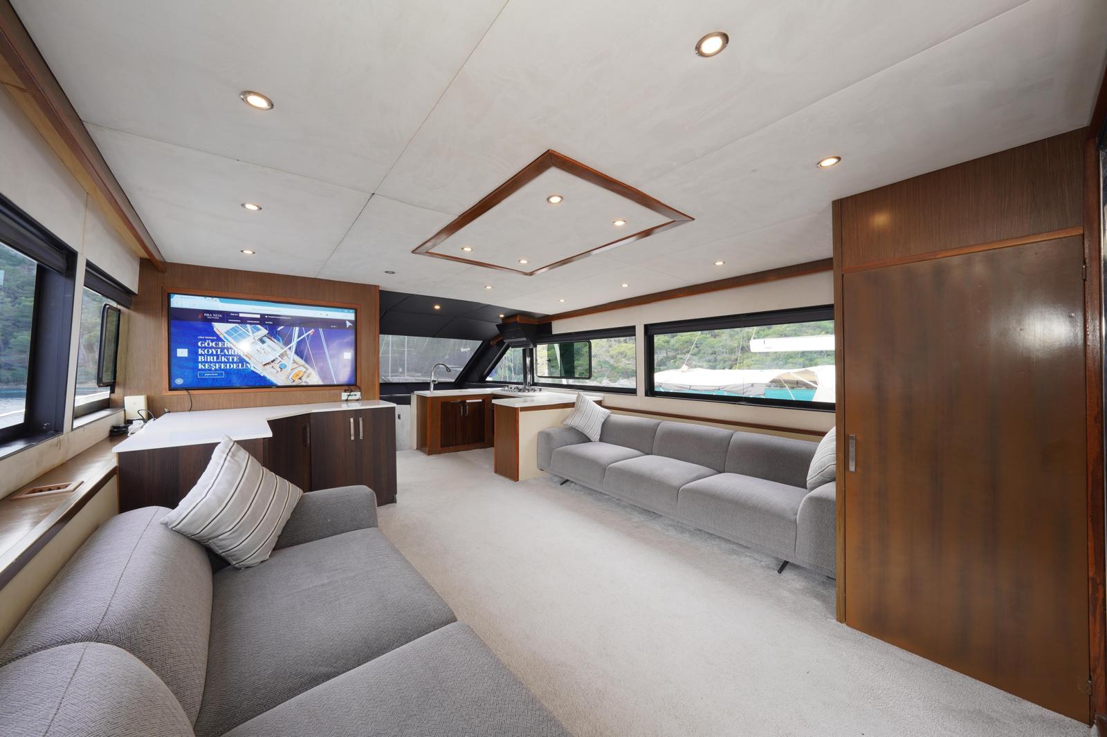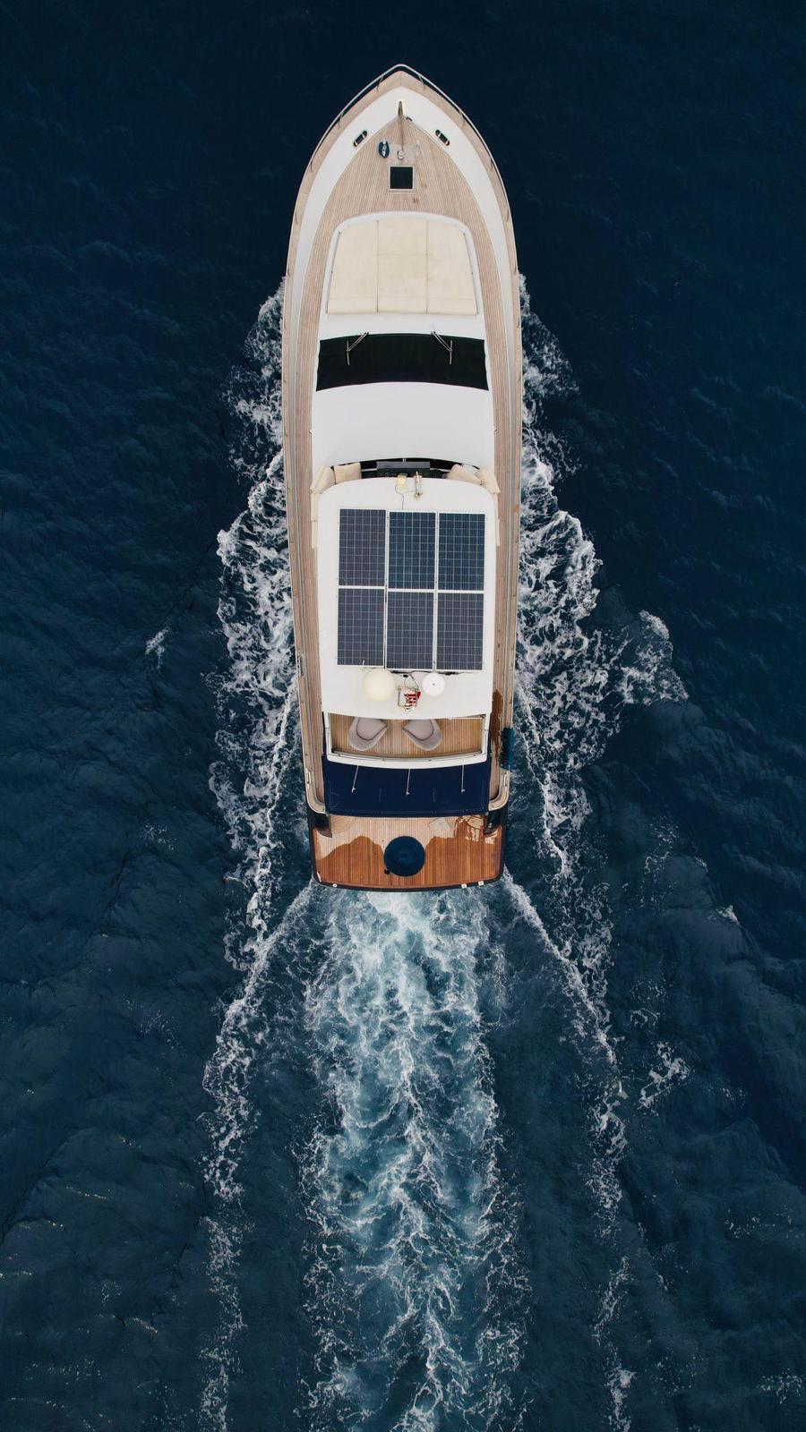You can watch the sea from above in the flybridge area, welcome the sunset on the large deck, and enjoy delicious meals in the stylish aft seating area.